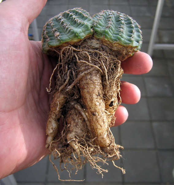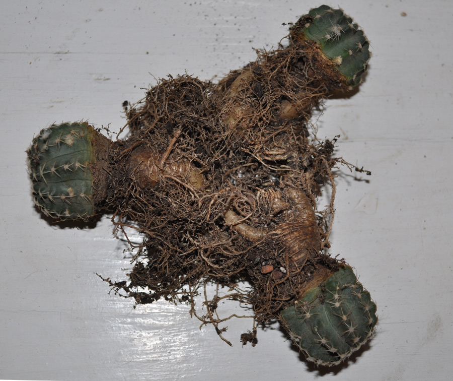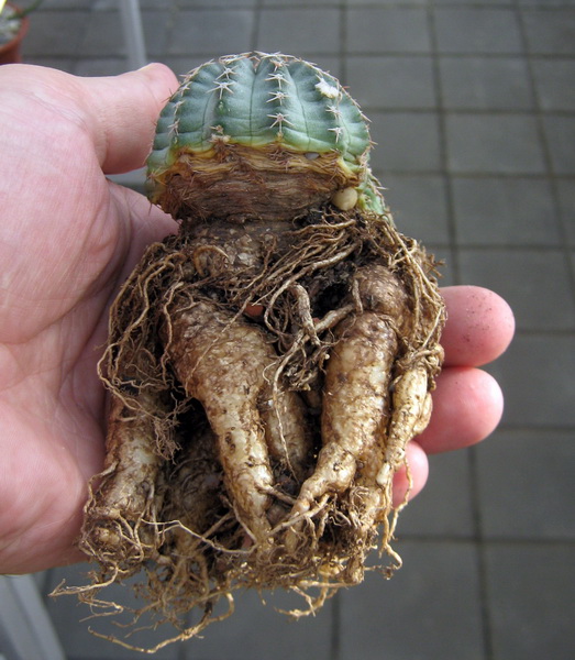А сейчас видно, что нету мелких корней. Грешу на субстрат. Везде, где в субстрате был перлит, в этом году проблемы с ростом. Корни не работают. Избавляюсь от перлита. Пытался замерить кислотность почвы - вроде все норм. В чем дело - не пойму. Но после пересадки все кактусы оживали.