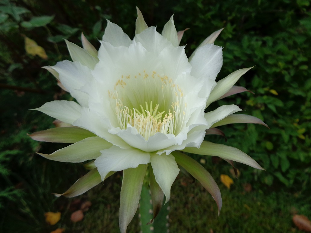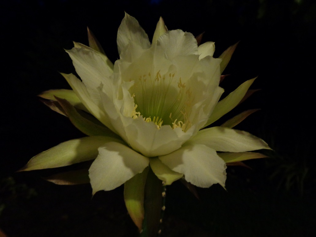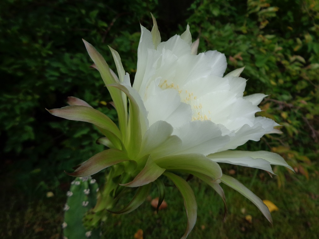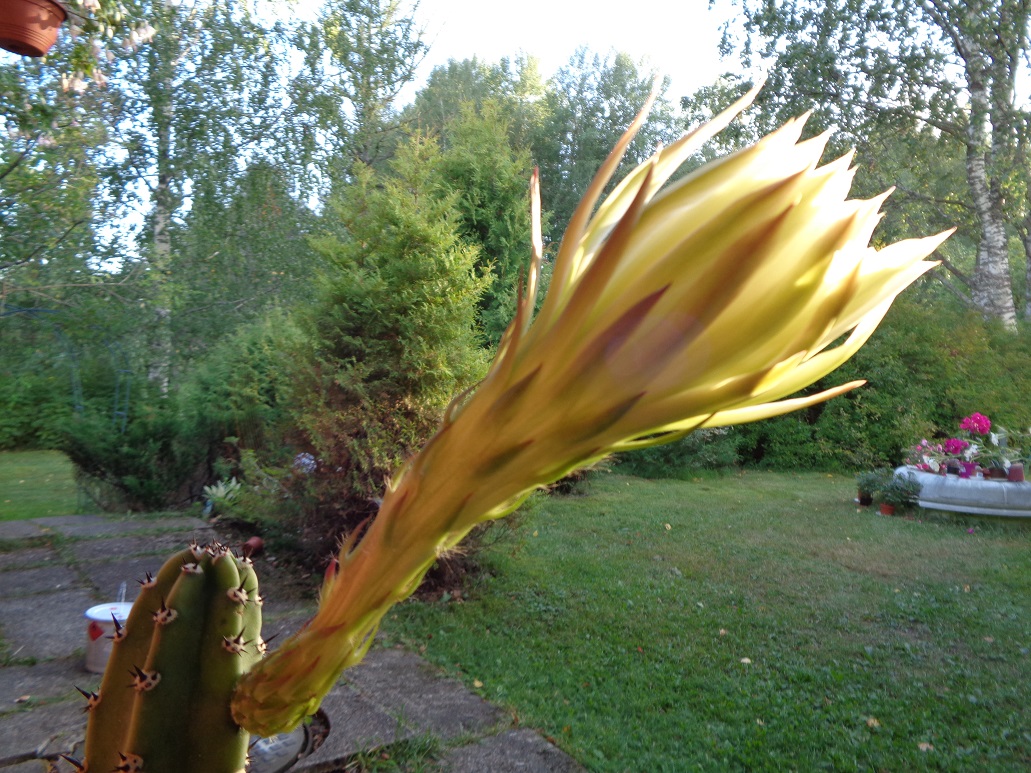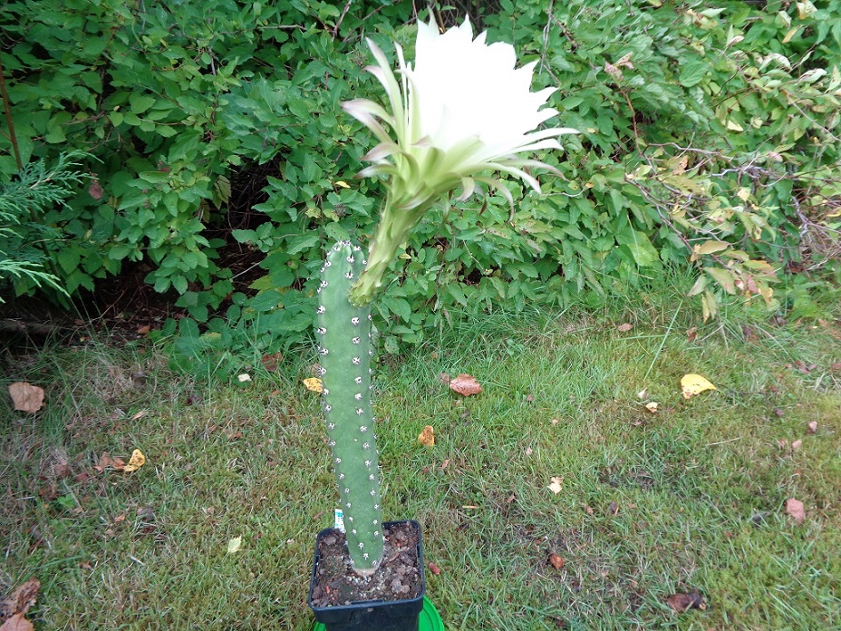 22 августа 2018 раскрылся прекрасный крупный цветок, напоминающий эхинопсис, но без пуха, с более короктой трубкой и очень характерными волнистыми лепестками, увы, практически без запаха. На следующее утро цветок увял. Растению около 5 лет.