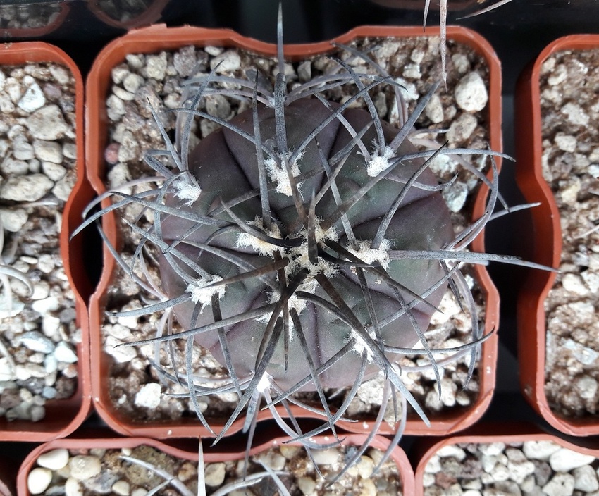 Вот, на мой взгляд, нечто подобное.Сообщение от Aleksey Посмотреть сообщениеВот такой G. cardenasianum (пока cardenasianum) вырос в посеве G. armatum SL 20-99 от 01.06.2016 (горшок 7 см). Один такой вот получился, темненький. Просыпается почему-то позднее своих арматумных собратьев, в этом году вообще к концу июня. Итого, максимум две ареолы на ребро в теплый сезон (у остальных с посева до трех). Сейчас дорастает колючка лишь с первых в этом году ареол. Потом месяц так будет сидеть. А там и осень...