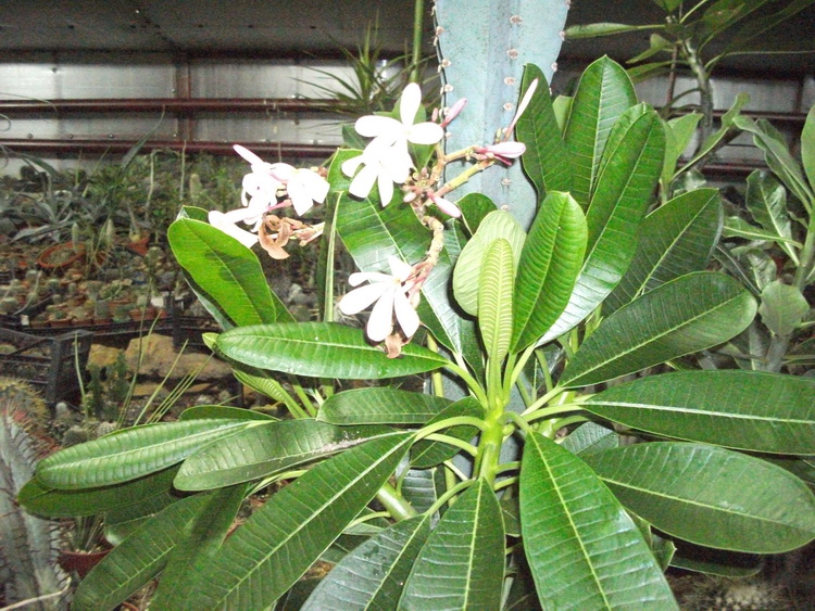 , напоминали они мне что-то типа мадагаскарского молочая). Однако неоднократно встретив мнение, что красота этих растений сосредоточена в аромате их цветков, стал понемногу собирать информацию, и выяснил, что существуют неплохие современные карликовые гибриды, способные хорошо расти и цвести под стеклом, не достигая гигантских размеров, как их родственники в тропиках. Первый посев в июне-2010 был удачен, все 5 семян Dwarf Abigail взошли за несколько дней, и по сей день растут легко и дружно. Однако жилка коллекционера не дала успокоиться и несмотря на угрызения совести ("уже некуда ставить!" "дорого!"), все же последовательно выписал маленькие привитые экземпляры карликовыx Francoise и Petit Prince. Растения хорошо прижились и совершенно без смущения продолжили летний рост. Как удалось выяснить, эти прививки в массе делают в питомнике во Флориде, а потом пересылают в Европу. У меня пока ассоциации, что плюмерии похожи на удивительные гибриды Олеандров и Адениумов, с которыми они в тесном родстве (сближает не только красота, но и ядовитость).