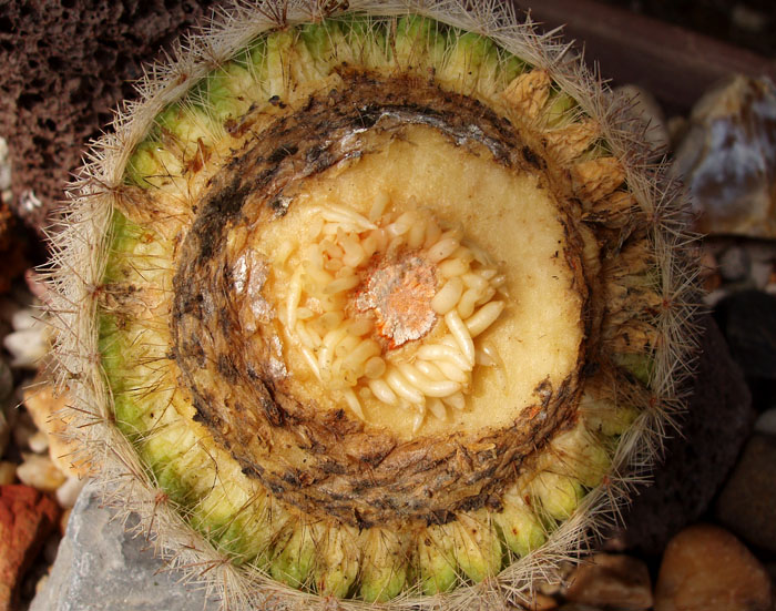 "Голландская" блоссфельдия была привита на хилоцереус. В месте срастания произошло загнивание и отторжение(не знаю, в каком порядке они произошли). Здорового привоя осталось довольно много, но в нём теперь дыра, уходящая глубоко внутрь и серьёзно затронувшая один бок.