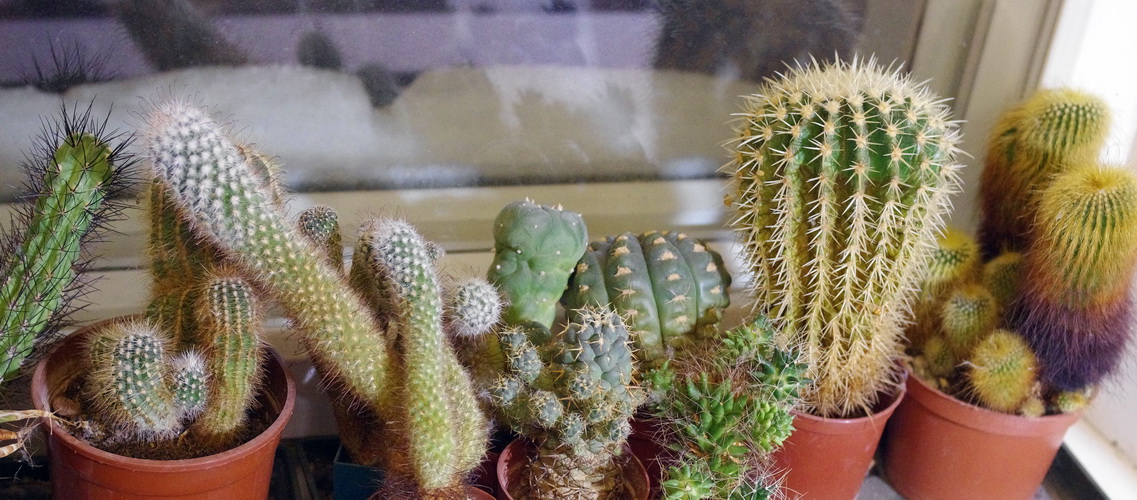 А вот в этом году так совпало, что у батареи под этим окном вышел из строя клапан-регулятор и включился на самую полную мощь до +26 в помещении, а на балконе поменялось остекление и там стало стабильно +5 - +12 в любой мороз. Кактусы стали переселяться в холодный зимний карцер и вот тут-то, когда до них дошли руки, что-то и произошло. Опуская эмоции, в сухом остатке до боли захотелось привести остающиеся в живых вопреки всему растения в порядок. Ну заслужили они этого всей своей жизнью, как Чарли Чаплин. И хорошего там осталось много.